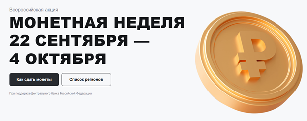 С 22 сентября по 4 октября по всей стране проходит Всероссийская акция «Монетная неделя», во время которой граждане могут обменять накопившуюся мелочь на бумажные деньги или зачислить сумму сданной мелочи на свой банковский счет.