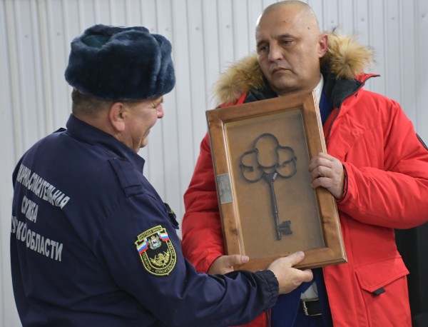 Игорь Уткин вручил начальнику ПЧ-129 в посёлке Балахнинский Владимиру Пидкоша символический ключ от нового здания и сертификат от Правительства Иркутской области.